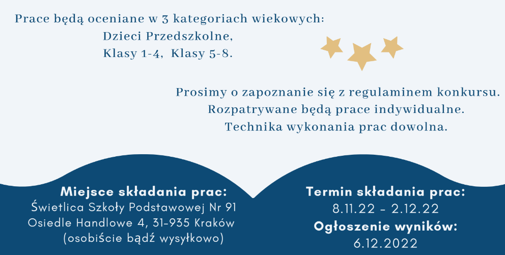 Prace można zrobić do 30.11.22 i przynosić je do p. Aleksandry Wnęk, która wszystkie ozdoby zaniesie do punktu zbiórki w Krakowie. Prace można zanosić także samodzielnie do 2.12, pod adres podany w regulaminie.