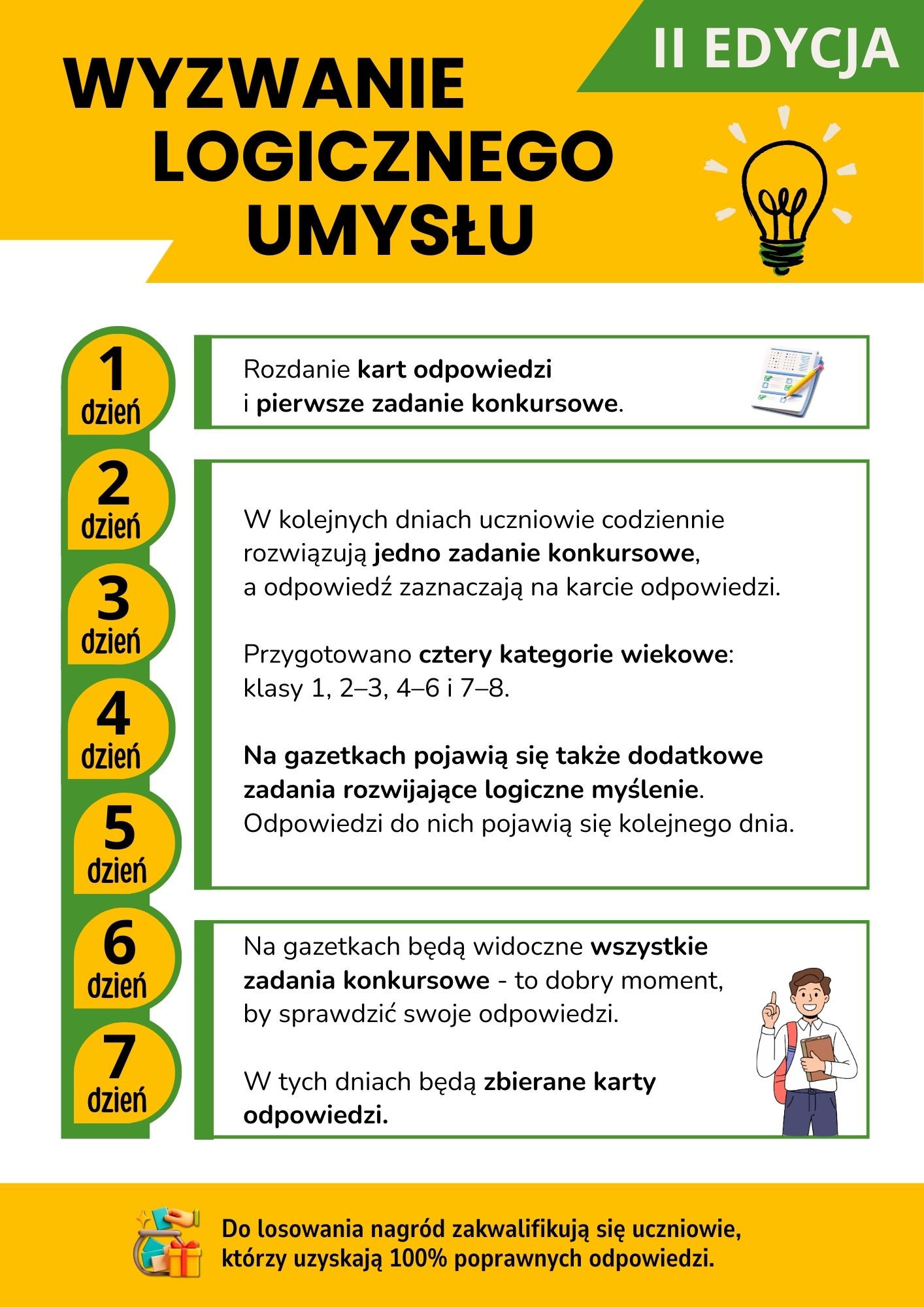 Codziennie na szkolnych gazetkach pojawią się różne zagadki i łamigłówki, rozwijające logiczne myślenie i kreatywność. Dodatkowo przez pięć dni uczestnicy będą mogli wziąć udział w konkursie, rozwiązując jedno zadanie konkursowe dziennie. Po zakończeniu wydarzenia odbędzie się losowanie nagród.